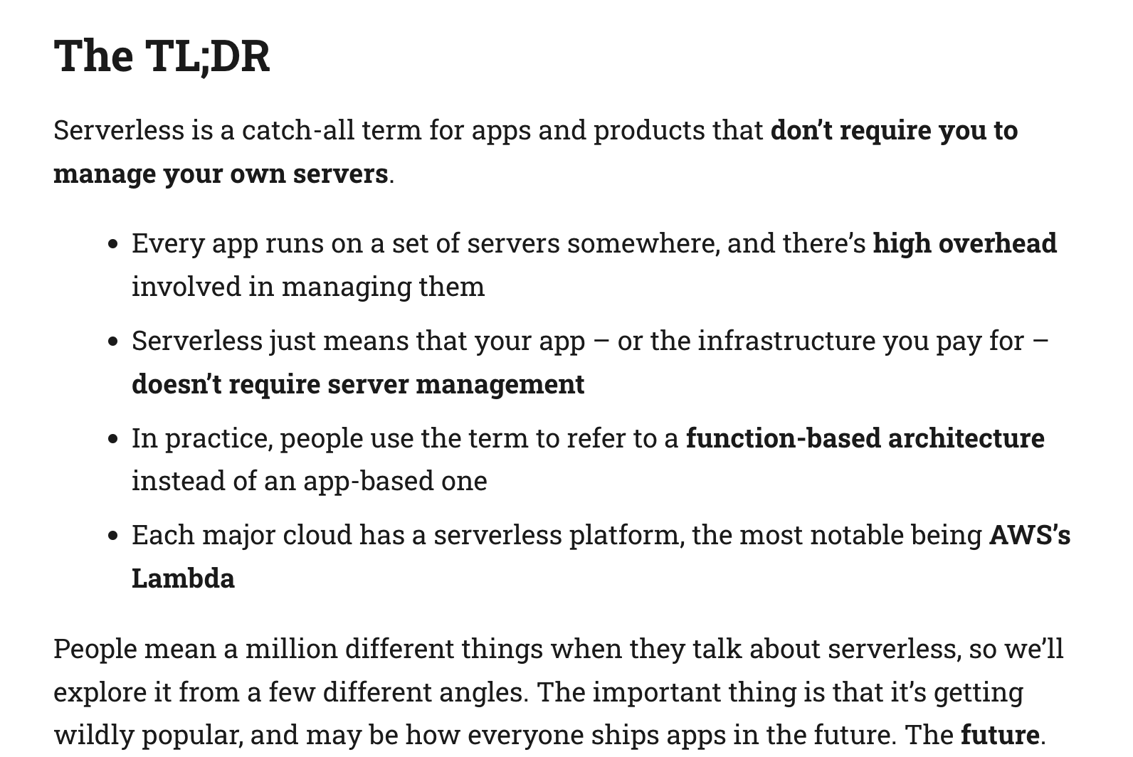 Every app runs on a set of servers somewhere, and there’s high overhead involved in managing them. Serverless just means that your app – or the infrastructure you pay for – doesn’t require server management. In practice, people use the term to refer to a function-based architecture instead of an app-based one. Each major cloud has a serverless platform, the most notable being AWS’s Lambda.